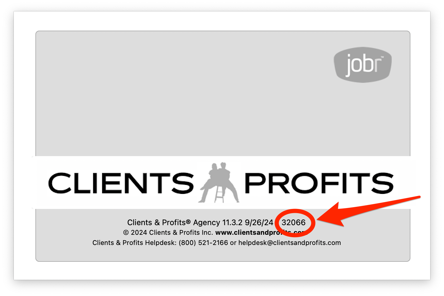 To check your build number (currently it should release 32066), go to Clients & Profits > About Clients & Profits, and you'll see the build number next to the date.