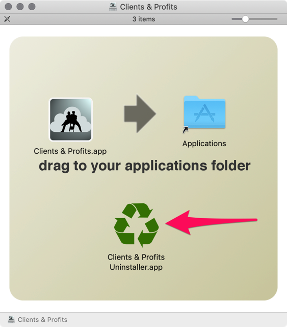 If using the DMG Installer, uninstall your current Clients & Profits application by using the Clients & Profits Uninstaller packed with the download for macOS.