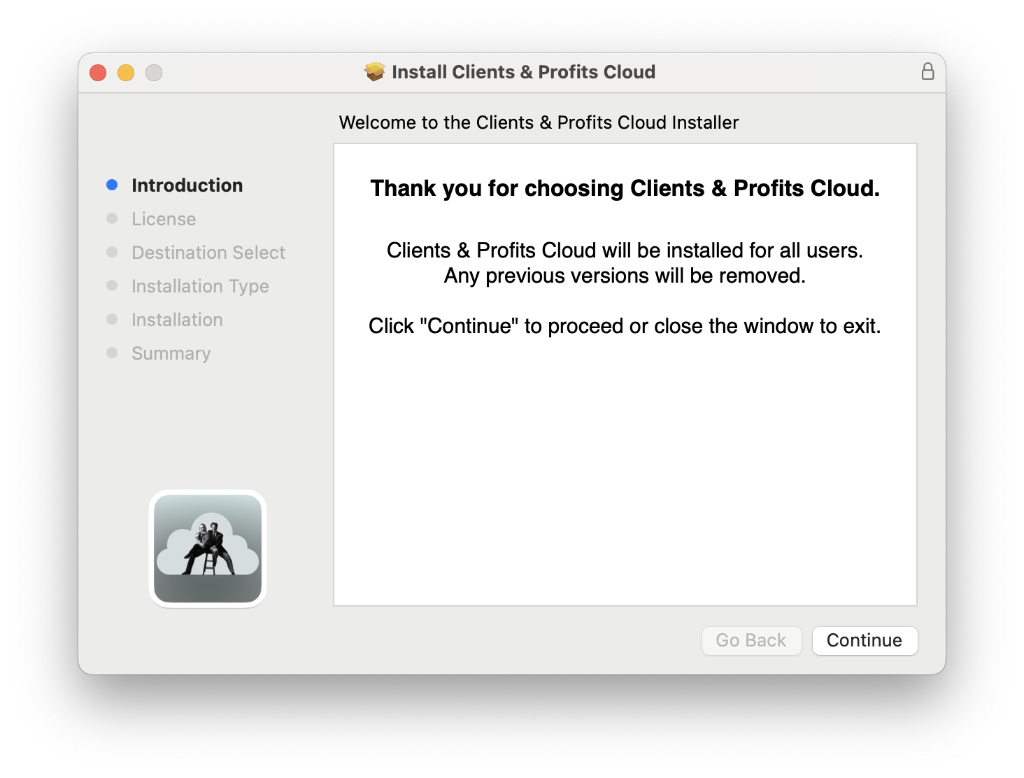 After downloading the package installer, run the Clients & Profits Cloud.pkg
