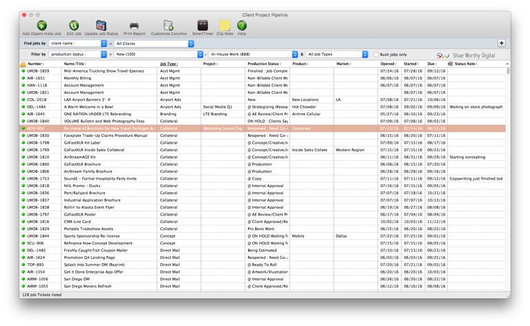 Open Jobs. Any new work should be opened as a job ticket, as it happens. A job ticket can be opened anytime after it is conceived, and certainly before the work begins. It's important to open new jobs as soon as possible, since purchase orders and time can't be tracked without a job number.