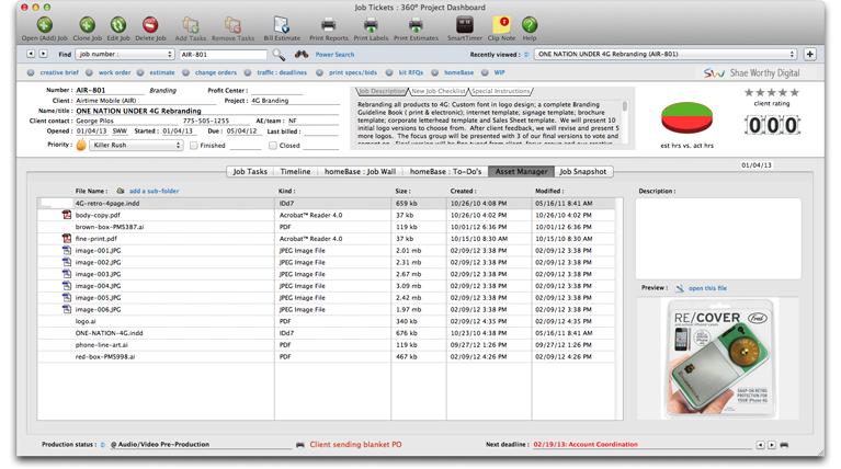The Clients & Profits asset manager helps your creatives, production staff, and AEs better organize a job's digital elements -- graphic files, word processing documents, page layouts, web pages, Flash files, fonts, and more. With all of a job’s assets in one place, there’s no more searching for disks or roaming the servers looking for a certain file.