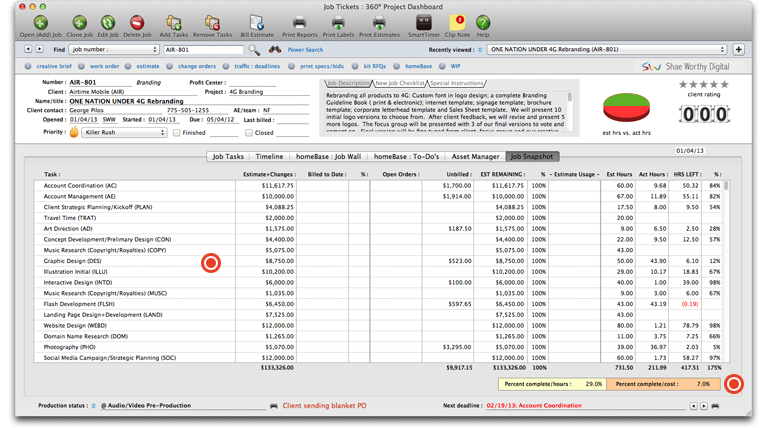 The Job Snapshot enables account executives to catch any problems before they become serious- and expensive or troublesome to fix. The Job Snapshots window supplies account executives, account coordinators, and others with an up-to-the minute snapshot of a job's progress. Quick calculations show the job's remaining estimate and profitability.