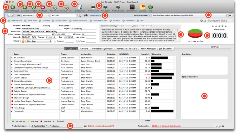 Job tasks are listed here, along with the current phase the task is in, the person responsible to complete each task, the start date, due date, hours left to complete the task, and a visual chart showing percentage of completion. Once the black bar fills this column, the task is finished.