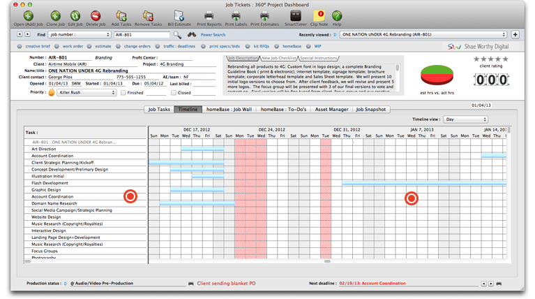 This Gantt Chart shows how your shop is doing in actual hours spent on the job vs the hours estimated on the original estimate. To the right, the number of days before this job is due. If the numbers are red, the job is behind schedule. The client rating indicates how happy the client was with the finished job.