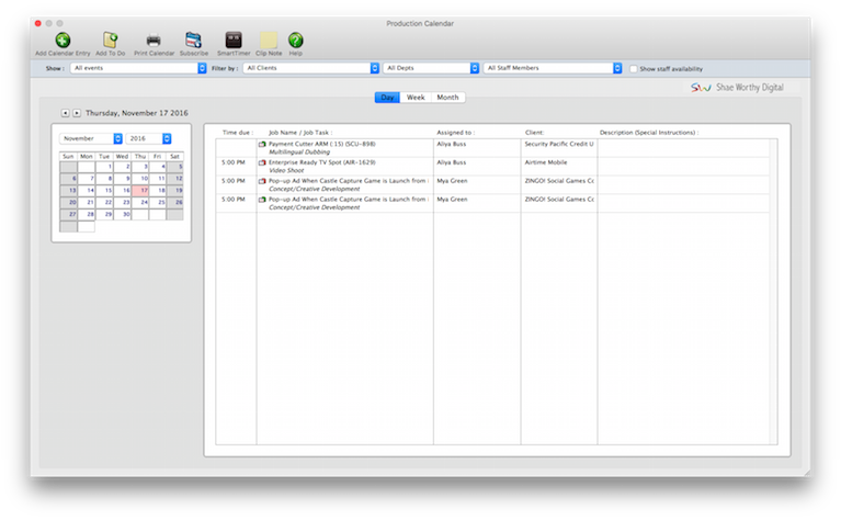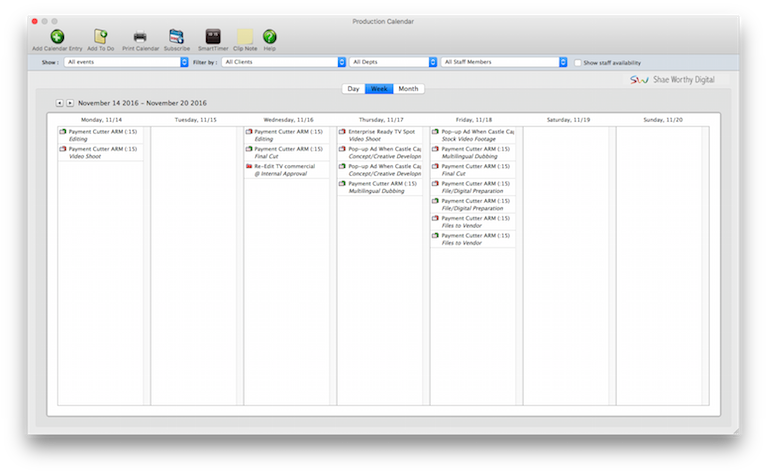 The Production Calendar has three real-time views: Day, Week, Month. The month view gives you the big picture. The week view gives you a days-of-the-week mode. The day view gives you the most detail about each event for the day you select.