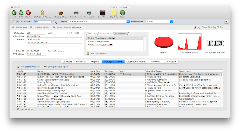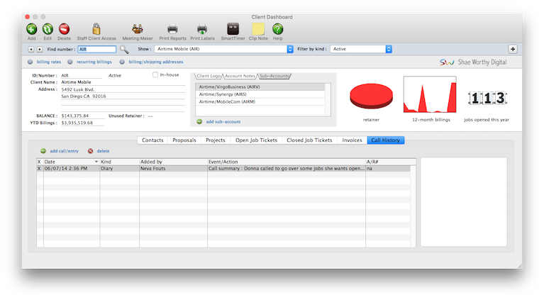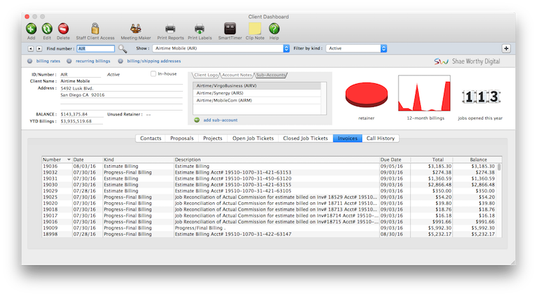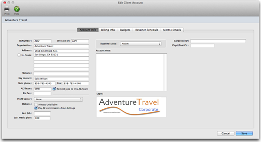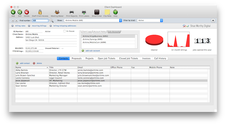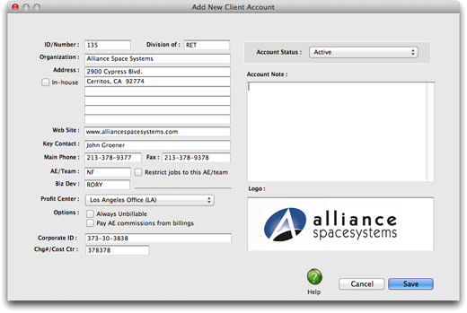 For better job tracking, you can have many clients from the same organization. A large corporate client, for example, might have 100 different departments or contacts who initiate jobs. Anyone who authorizes work can be added as a separate client account. When jobs are billed, the work from several different clients can be combined on one invoice -- and even billed to an entirely different client account.