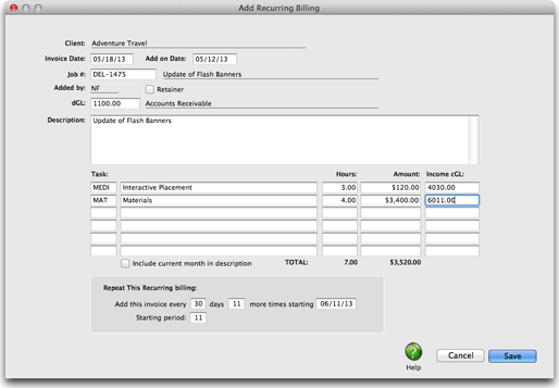 3 Enter the number of days between which the invoice should be repeated, the number of times the invoice should be repeated, the starting date and period to begin the recurring schedule for this invoice, and the when the recurring billing should be posted.