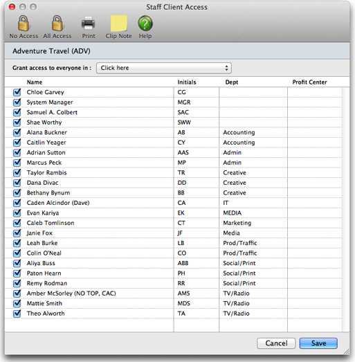 When new staff members join the company, be sure to check their access to clients. Also, when a staff member leaves be sure to remove them from their client access privileges by clicking the “no access” checkbox.