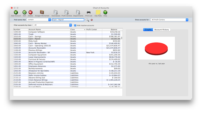 The Clients & Profits chart of accounts is completely customizable. You can have as few or as many accounts as you need (there’s no real limit to the quantity of accounts). Each account has an account number, classification, sub-class, and categories for cash flow and ratio reports. Separate accounts can be set up for different profit centers and departments. Every account keeps real-time running balances for up to 24 accounting periods. For more information, see the Chart of Accounts FAQ and the General Ledger FAQ.