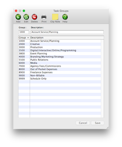 Task Groups are indirectly used throughout Clients & Profits. Every user can belong to one Task Group, which is entered in the user’s General access privileges window. A Task Group table can be created with codes and names that describe each Task Group. Each Task Group is identified with a number (from 1 - 99), a short name, and a long description of the Task Group’s function (which is optional).