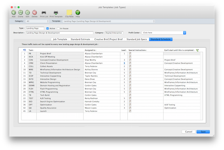 the contingency). You can assign certain tasks to a job template, so that every new job gets the