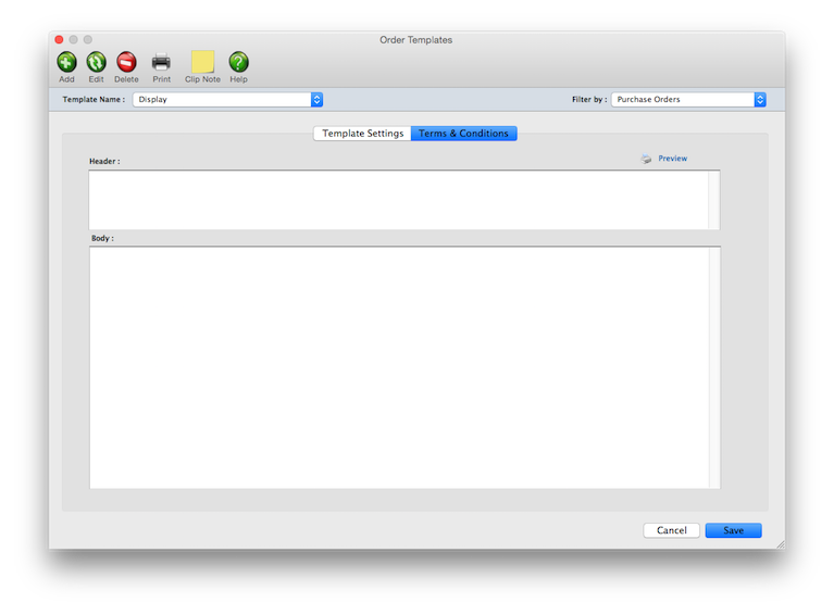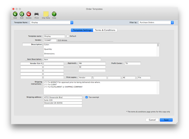 Templates can be created for all kinds of purchases (e.g., printing, delivery, typesetting, etc.). Dozens of templates can be set up, and their settings can be changed anytime. Once a template is made, it is applied to new POs -- the template’s details are copied to the new purchase order, replacing your PO preferences.