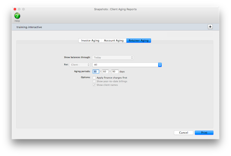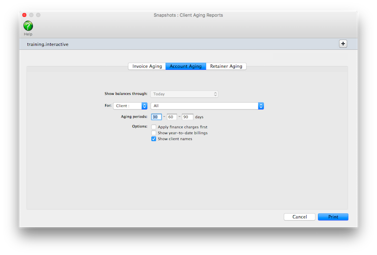 These periods are used to calculate aged balances for every invoice, based on the invoice date and today’s date. You can use any set of aging periods, including a different set each time you print client agings.