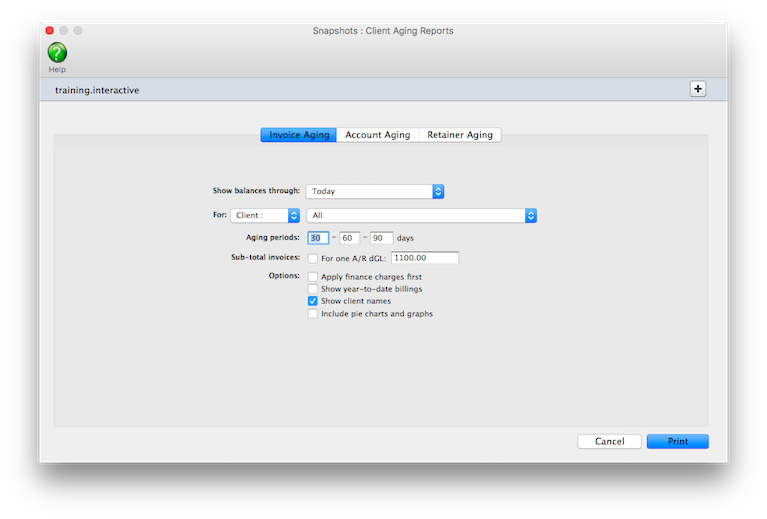 2 Choose the kind of aging report (i.e., Invoice Aging, Account Aging, or Retainer Aging)