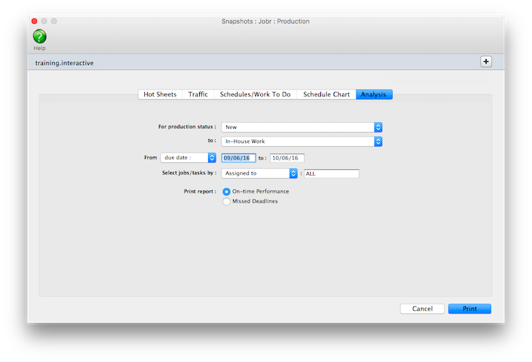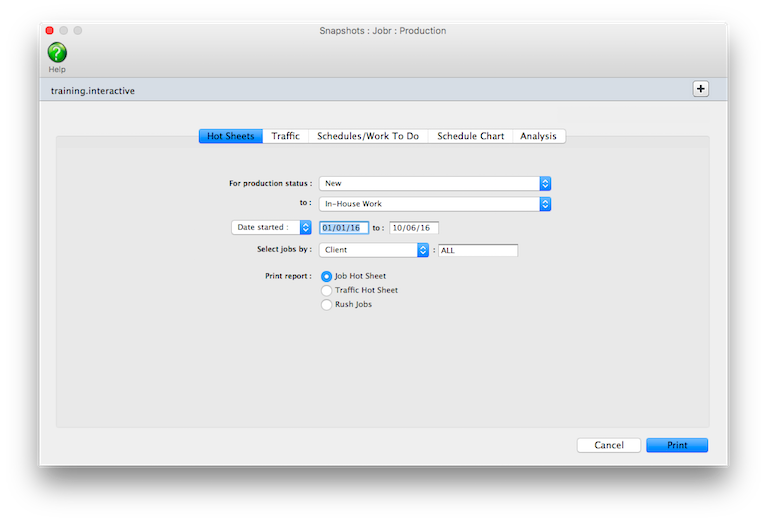 The Job Hot Sheet reports show jobs by production status, sorted by job number. Each job shows its job number, job name, client, and status. The Job Hot Sheet can show jobs selected for a range of start dates, due dates, added dates, or closed dates. It’s like the job lists you can also print from the Job Ticket window.