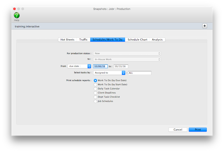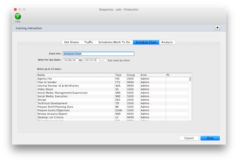 | Schedule Chart | The Schedule Chart lets you choose the unfinished tasks you want to see and sorts them by job number or client. So instead of seeing every unfinished task for the week you can print just a select few (e.g., artwork, copywriting, and design). |