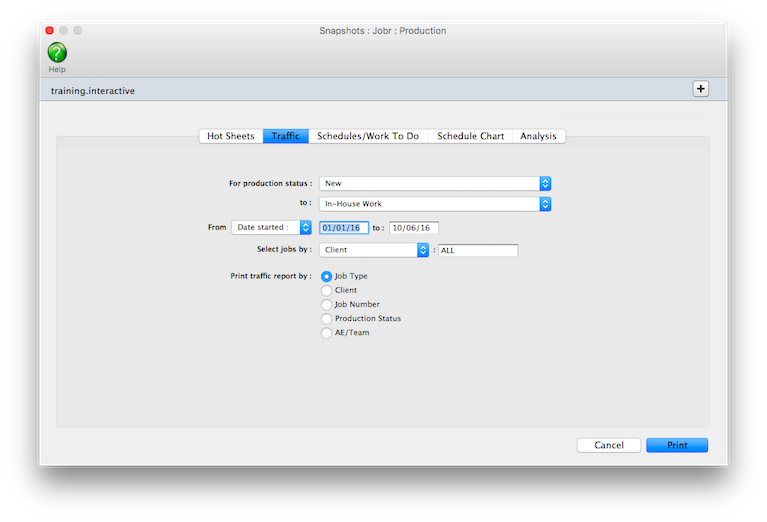| Traffic by Client | he Traffic by Client report lists each clients’ jobs by job type, showing the jobs’ milestones. A separate page is printed for each client’s jobs. |