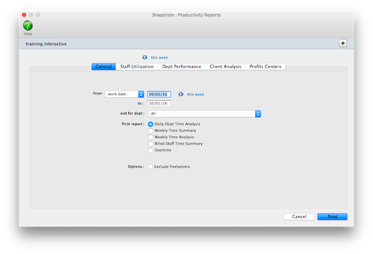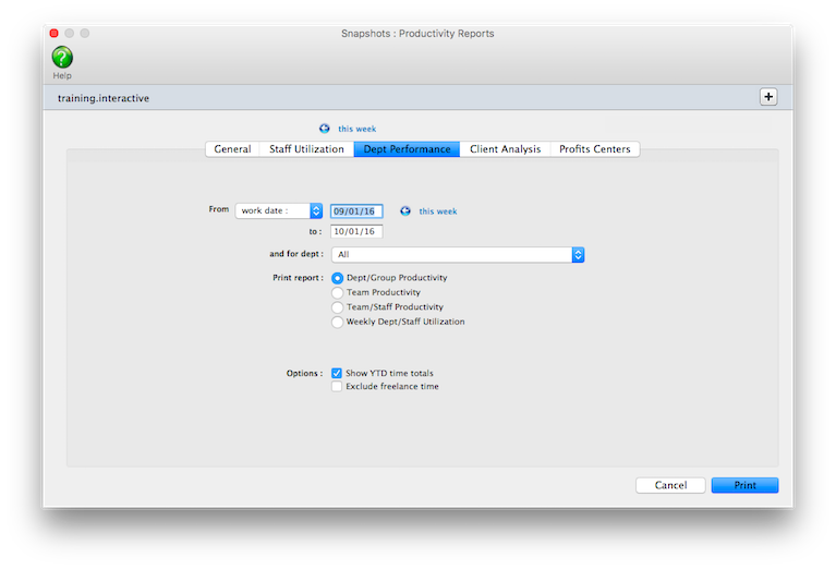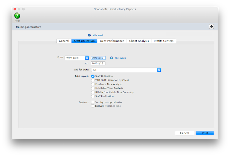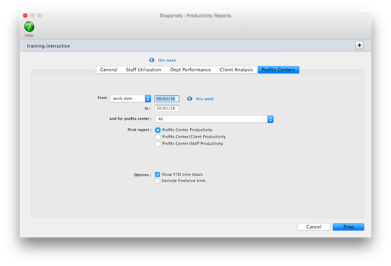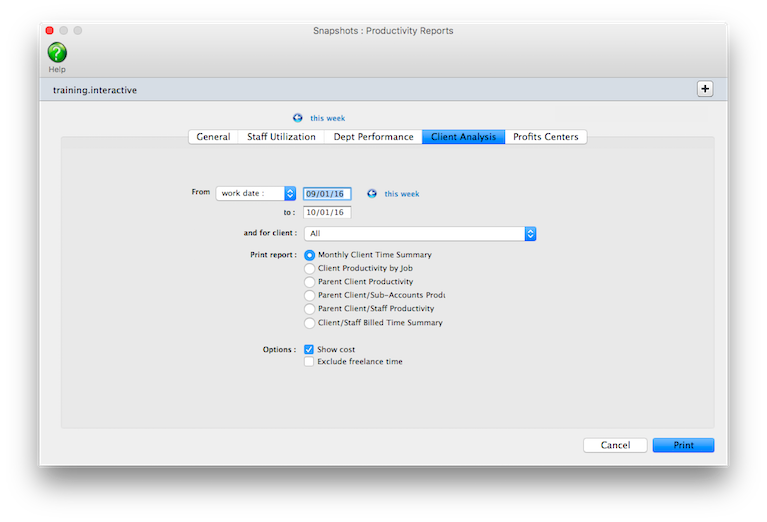 Productivity reports don’t show billings. They’re less concerned with how the time was billed (or not billed) than with how the time was actually spent, since the cost of your staff is mostly fixed (unless they’re freelancers, that is). One reason for printing productivity reports is to see how time is being used, and especially if it is being managed properly. One of the reasons to track productivity is to ensure that the right people work on the right clients (i.e., the higher-paid staffers should only work on the most profitable clients, etc.).